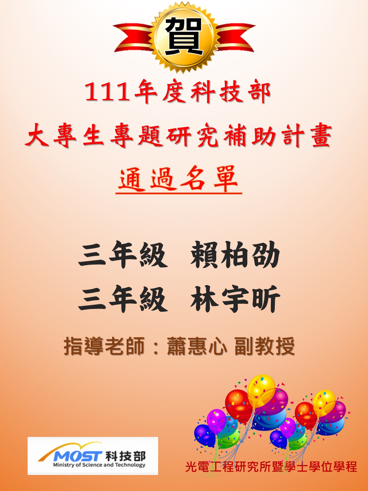 賀~111年度科技部大專生專題研究補助計畫通過名單三年級賴柏劭、林宇昕 (指導老師:蕭惠心 副教授)