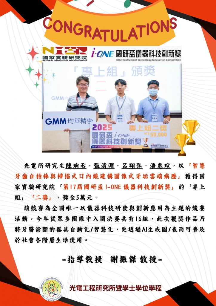 賀~本所研究生陳珦丞、張清淵、呂翔弘、潘惠瑄獲國家實驗研究院「第17屆國研盃 i-ONE 儀器科技創新獎」「專上組」「二獎」 Post author:ieo Post published:2025-10-29 賀~本所研究生陳珦丞、張清淵、呂翔弘、潘惠瑄獲國家實驗研究院「第17屆國研盃 i-ONE 儀器科技創新獎」-「專上組-二獎」