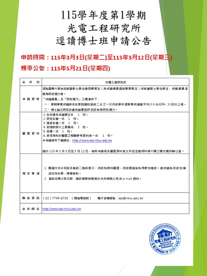 【公告】115學年度第1學期逕讀博士班申請